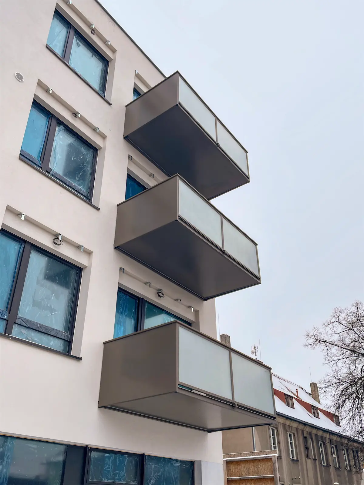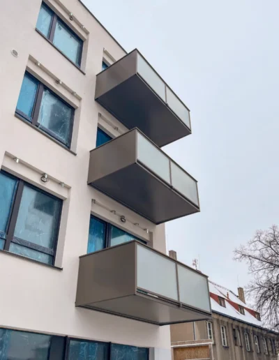 Závěsné ocelové balkony s vlastní nosnou konstrukcí.