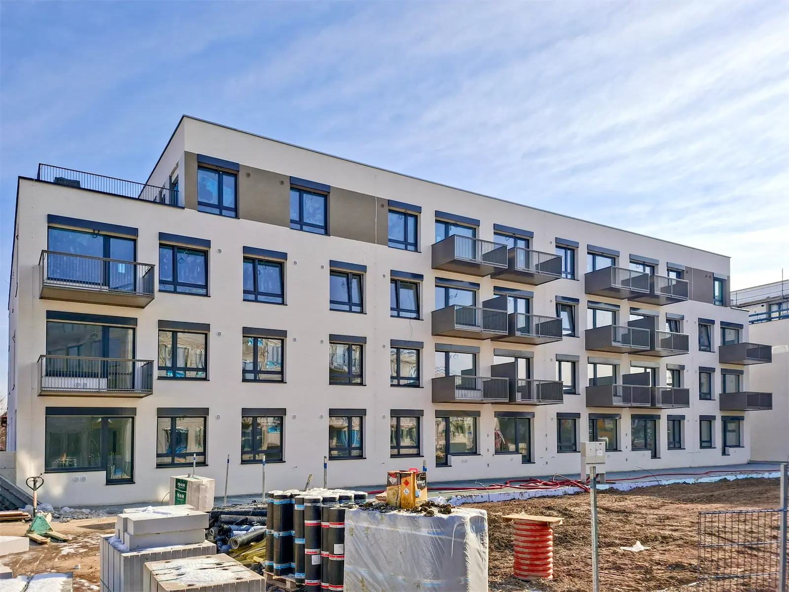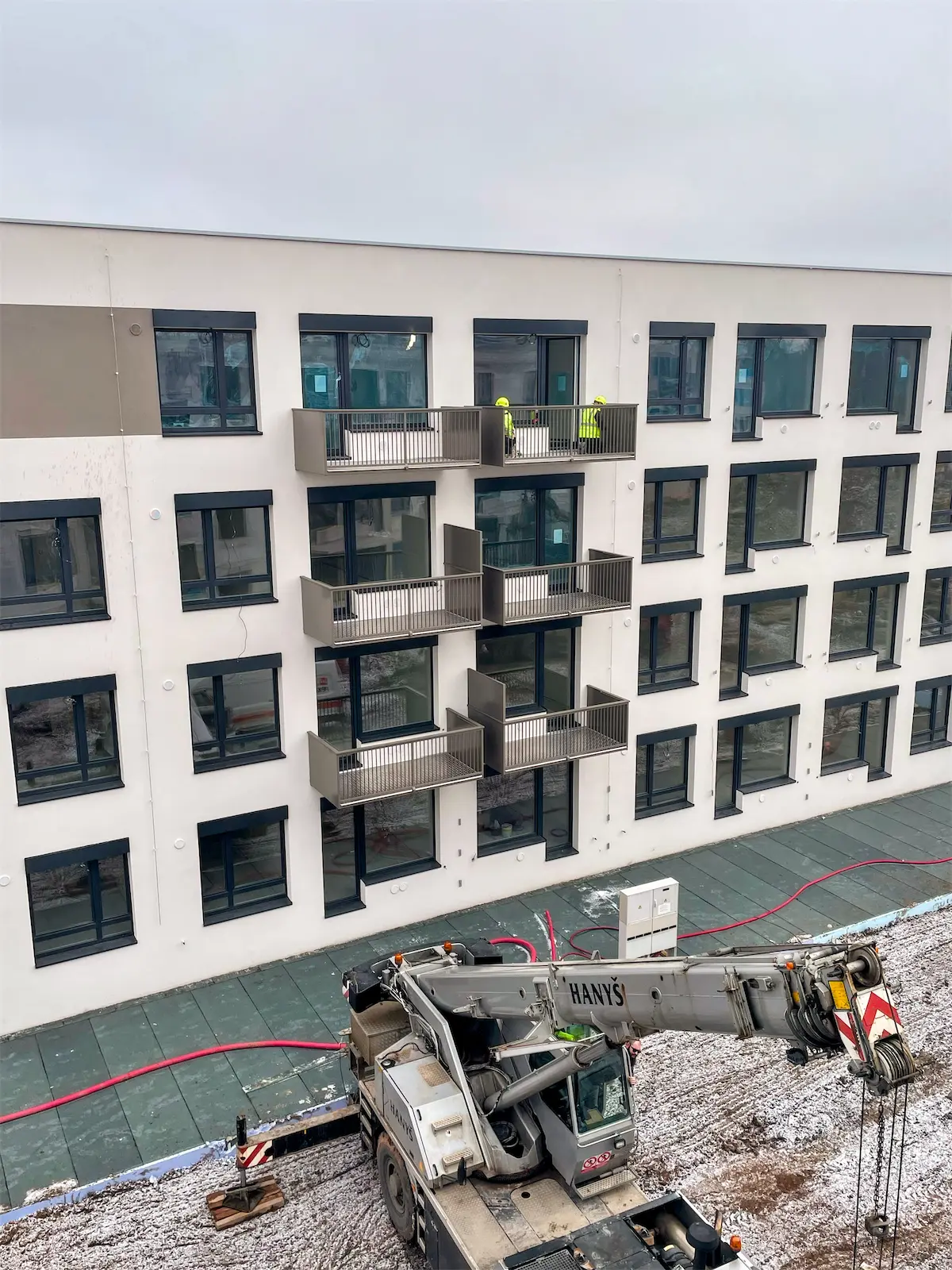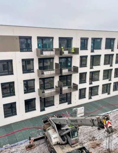 Montáž těchto 61 balkonů na 2 bytových domech, z obou stran, byla provedena za pohých 6 dní.